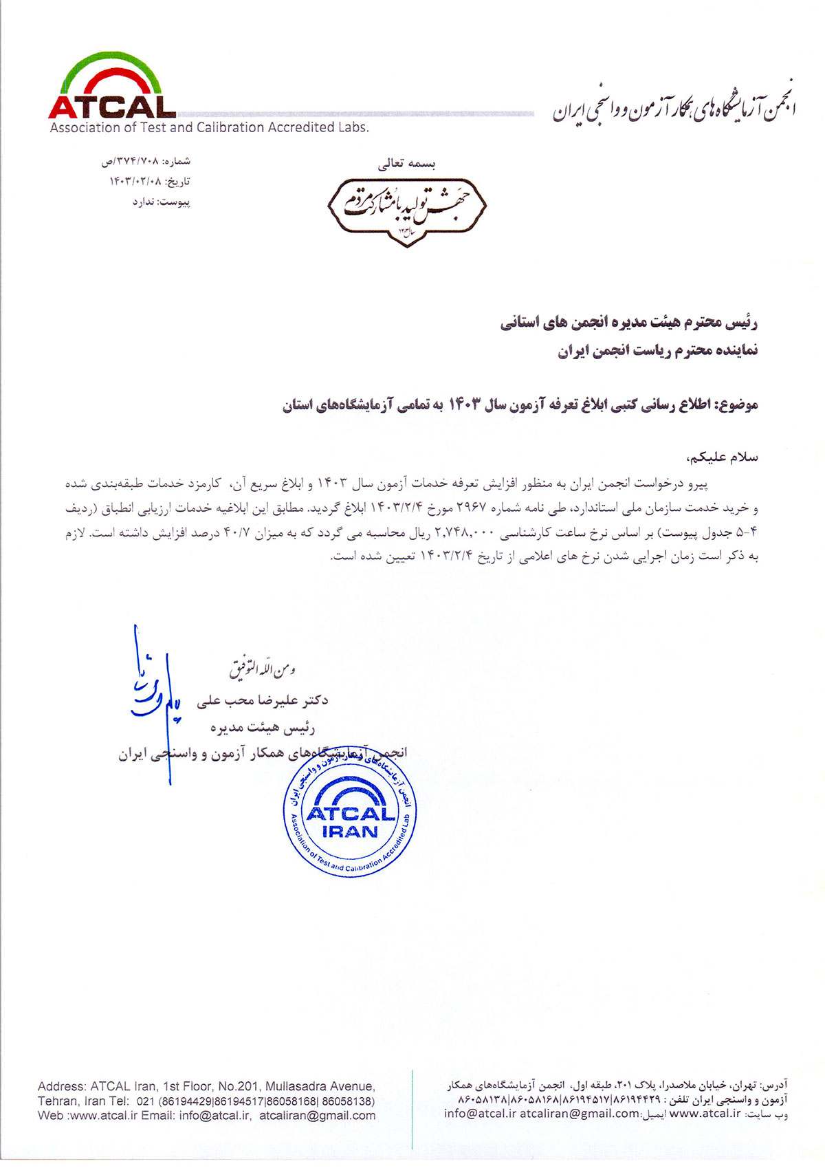 تعرفه 1403 خدمات آزمون استاندارد ابلاغ شد. با پیگیری و مکاتبات انجمن آزمایشگاه های همکار آزمون و واسنجی ایران در سال گذشته و دستور ریاست سازمان ملی استاندارد، تعرفه خدمات آزمون آزمایشگاههای همکار استاندارد در تمامی زمینه های ارزیابی انطباق ۴۰.۷ درصد افزایش یافت. بر اساس ابلاغ معاونت توسعه مدیریت، امور حقوقی و مجلس سازمان ملی استاندارد، مقرر شد افزایش تعرفه بر مبنای نرخ ساعت کارشناسی ۲.۷۴۸.۰۰۰ ریال محاسبه شود. بر همین اساس نرخ تعرفه در سامانه های مرتبط با سازمان ملی استاندارد نیز بروزرسانی می شود.